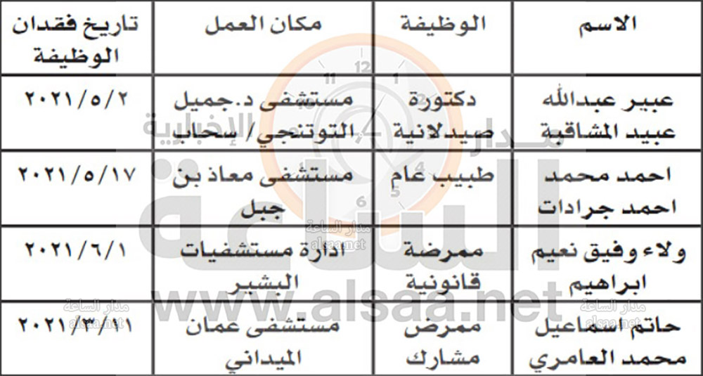 مدار الساعة - أعلنت وزارة الصحة اليوم الأحد اعتبار كل من الموظفين التالية اسماؤهم فاقدين لوظائفهم نظرا لتغيبهم عن مواقع عملهم لمدة تزيد عن عشرة ايام متصلة او متقطعة.ً.