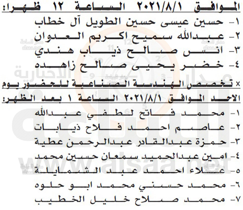 ودعتهم الوزارة الى التواجد في مبنى وزارة العمل / الدوار السابع / بجانب كوزمو في الموعد المحدد لكل منهم، مع ضرورة الحضور قبل الموعد بنصف ساعة مصطحبين معهم بطاقة الأحوال المدنية الصادرة عن دائرة الاحوال المدنية والجوازات، علما بانه لن يتم السماح لأي من المرشحين بدخول قاعات المقابلات ما لم يتم الالتزام ببروتوكول السلامة العامة وكل من يتخلف عن الحضور يعتبر مستنكفا: