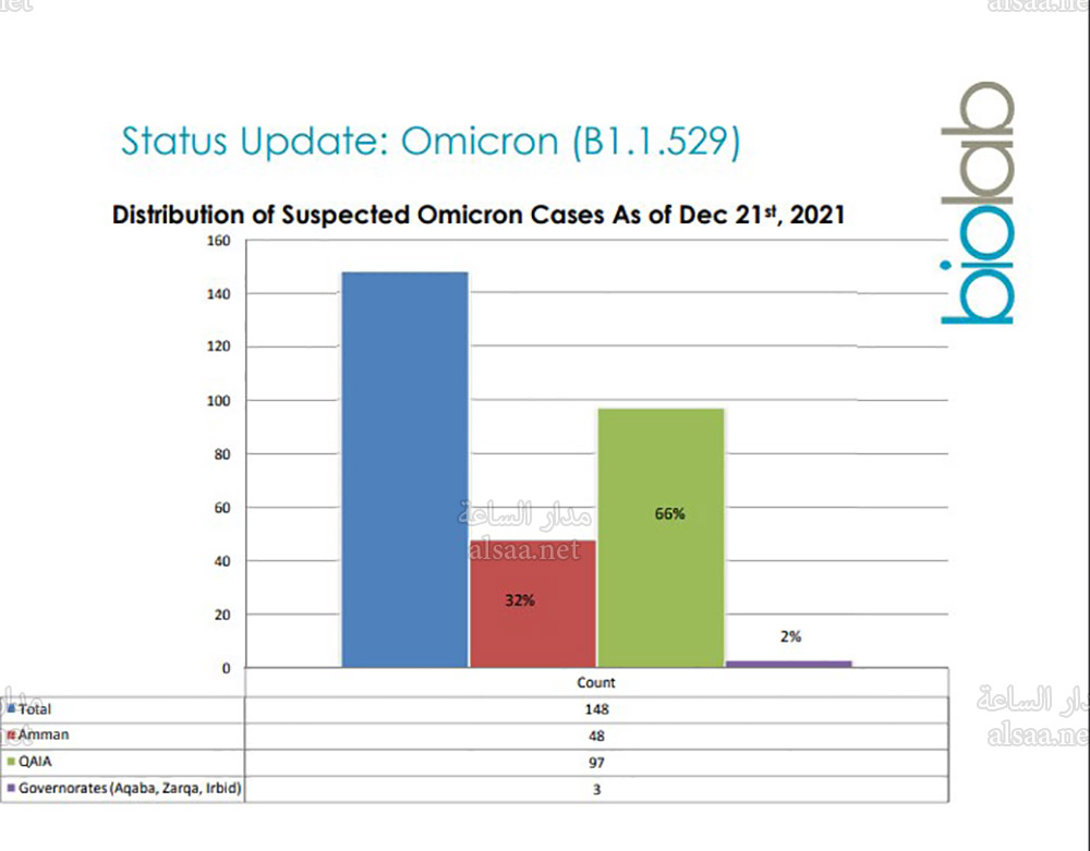 مدار الساعة - في الوقت الذي أعلن فيه تقرير صادر عن مختبر بيولاب الطبي، واطلعت عليه "مدار الساعة" عن اكتشاف 148 إصابة مشتبها بها بالمتحور أوميكرون في الأردن خلال 16 يوماً. خرجت وزارة الصحة لتؤكد ان عدد الإصابات بحالات أوميكرون في المملكة 21 إصابة.
