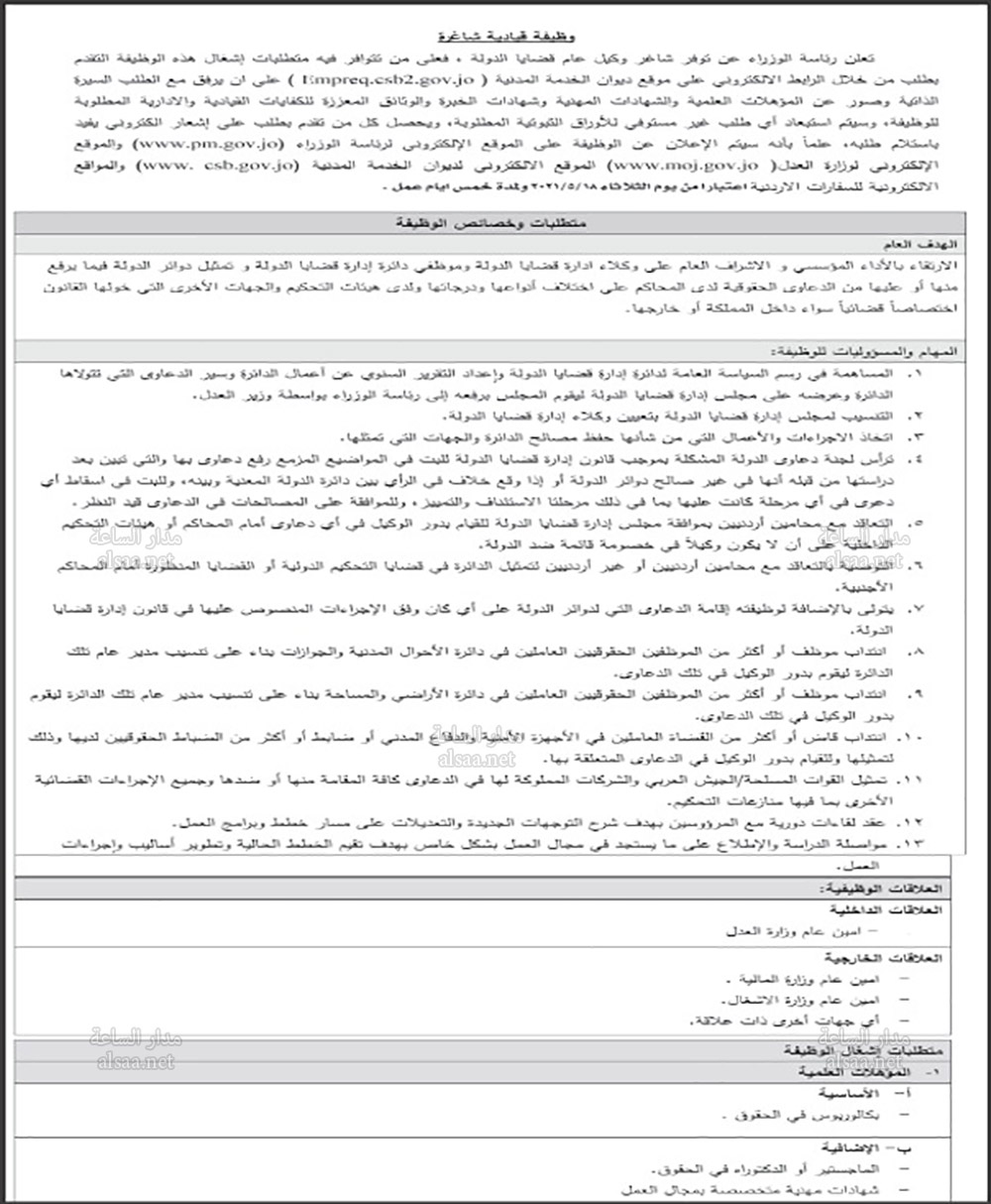 مدار الساعة - أعلنت رئاسة الوزراء اليوم الاحد على موقعها عن توافر شاغر وكيل عام قضايا الدولة