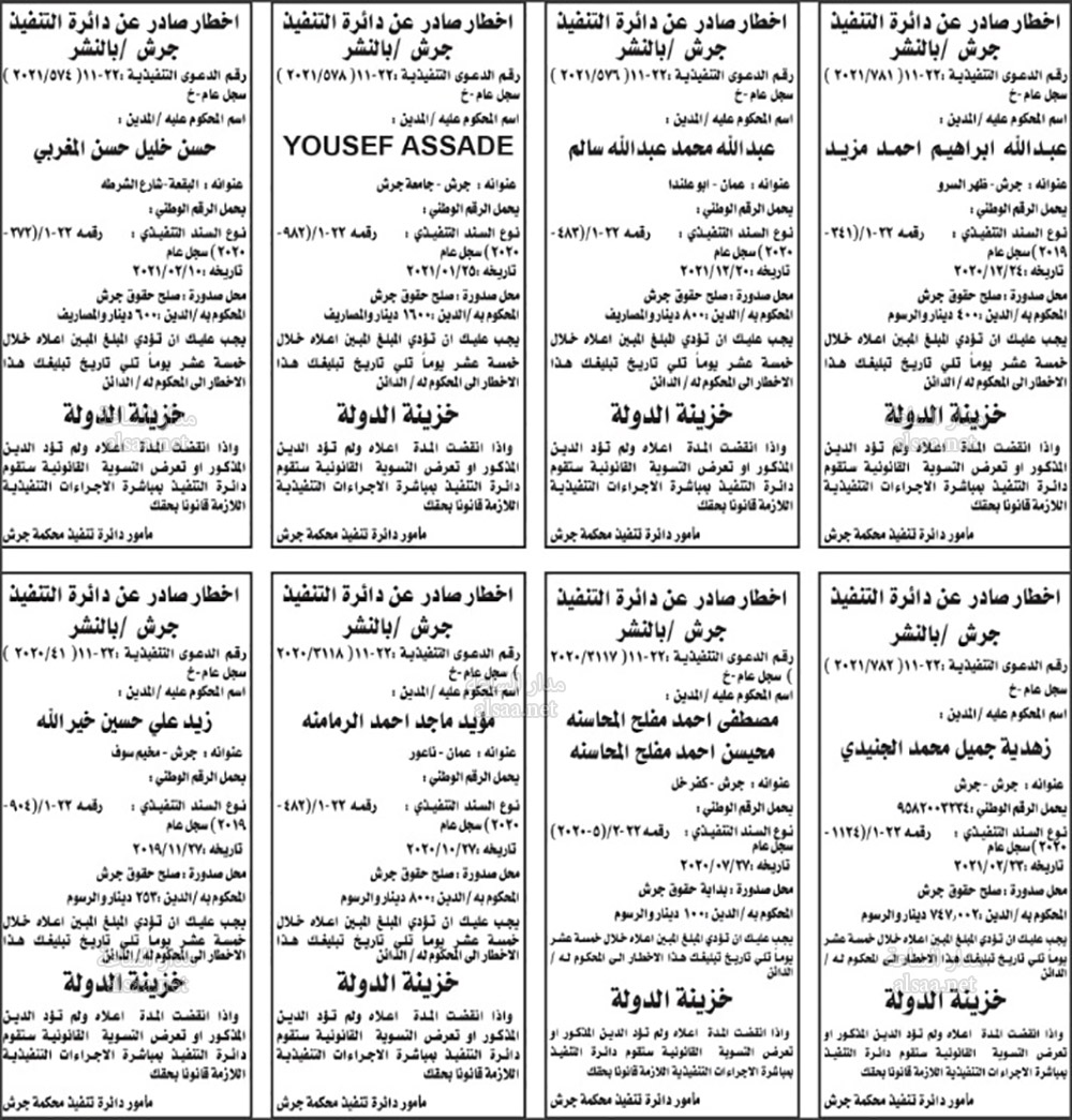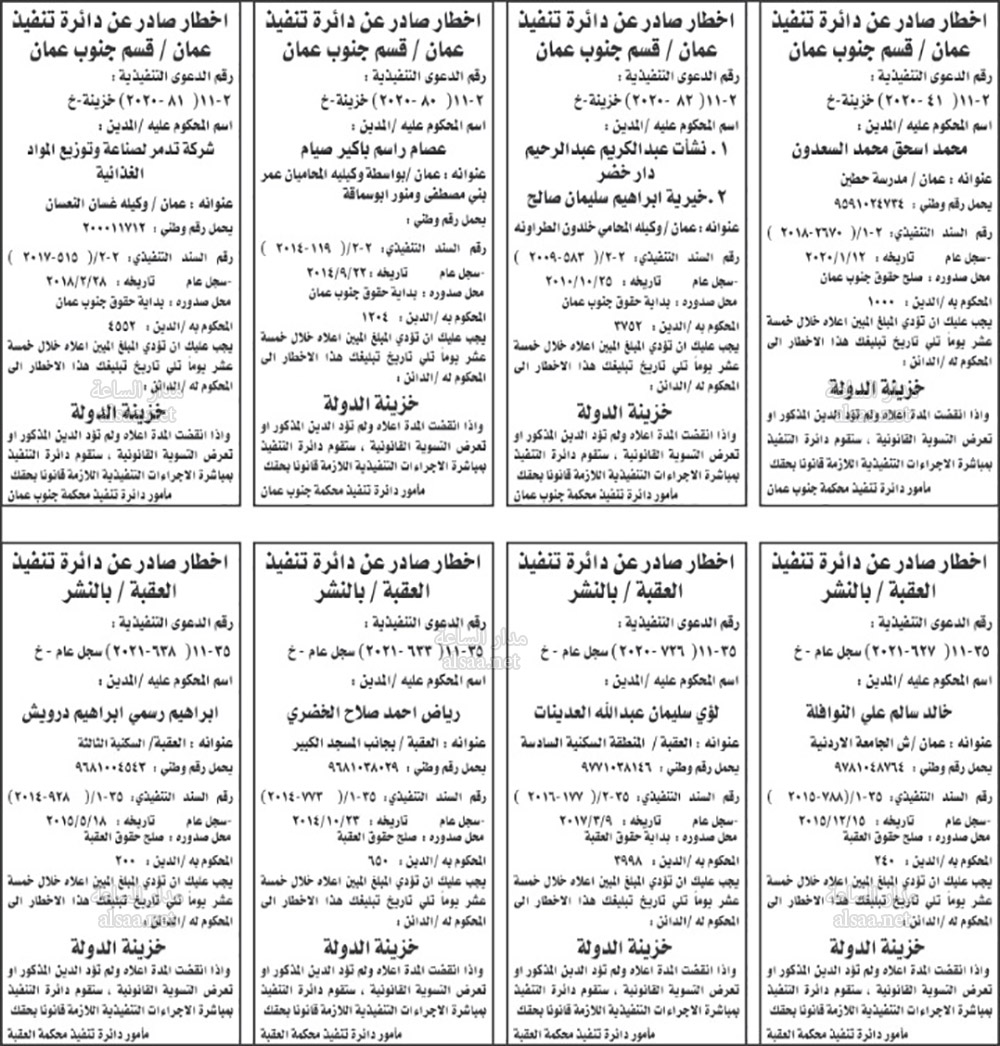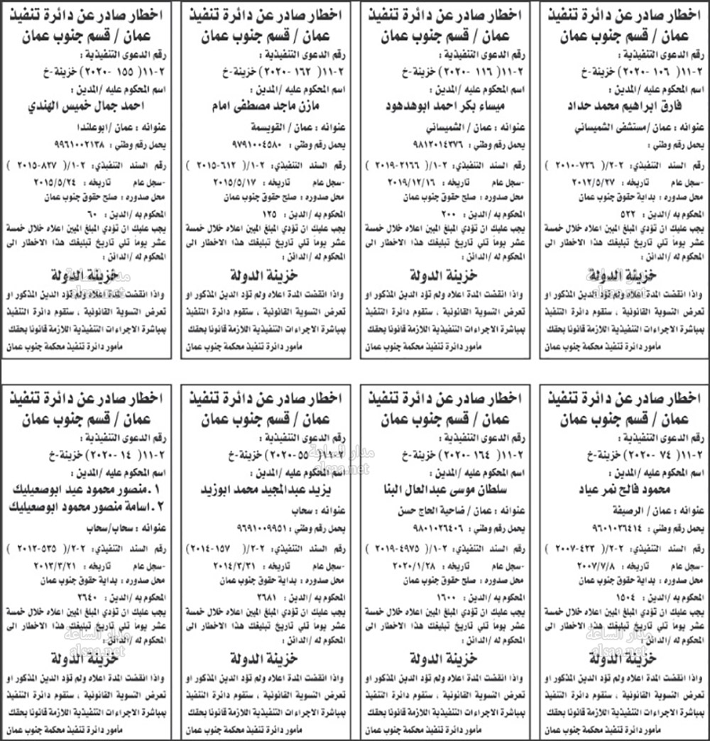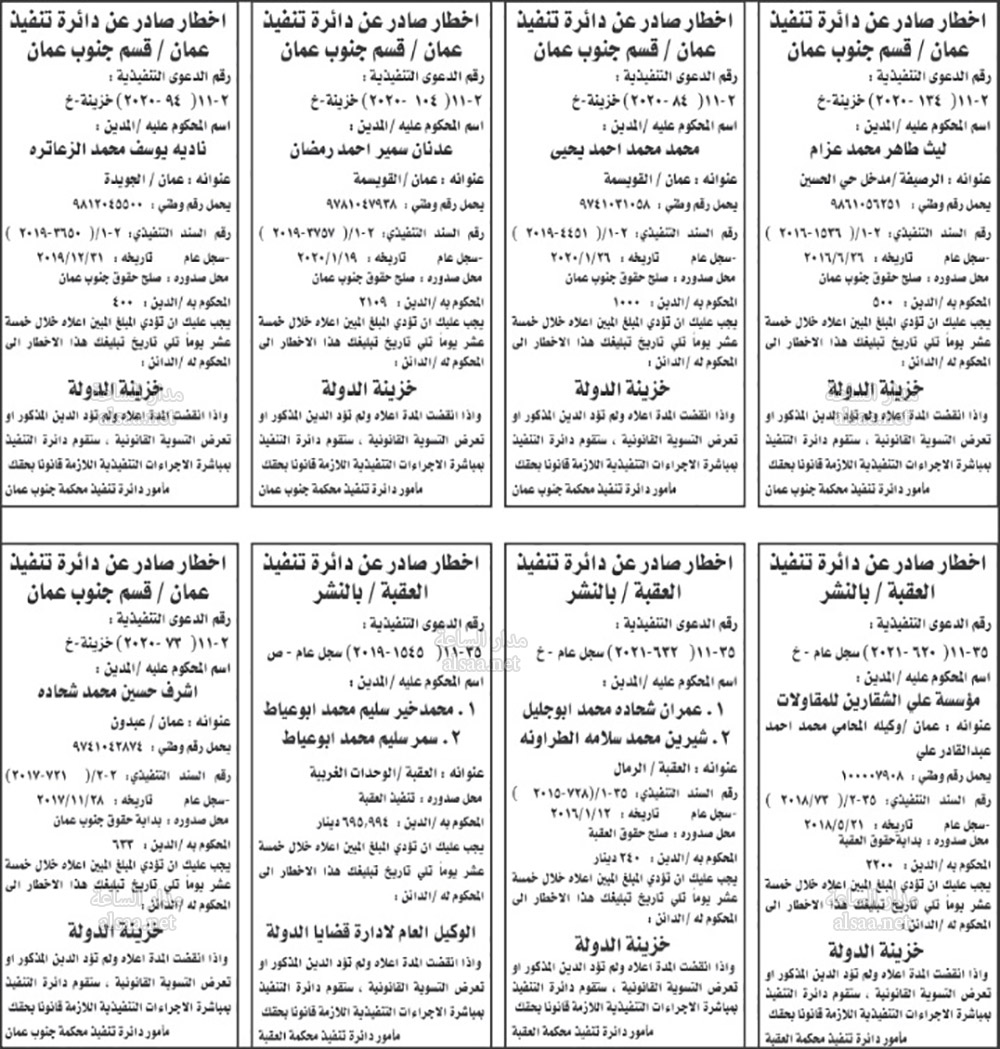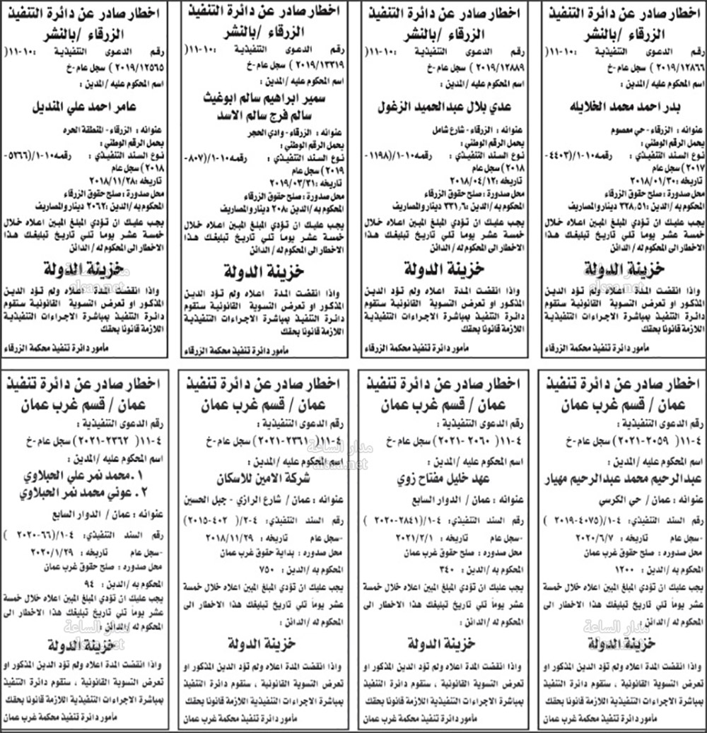 مدار الساعة - صدرت اليوم الأحد اخطارات عن دوائر تنفيذ بالنشر حول عدد من الدعاوى التنفيذية باسماء مدينين لخزينة الدولة.