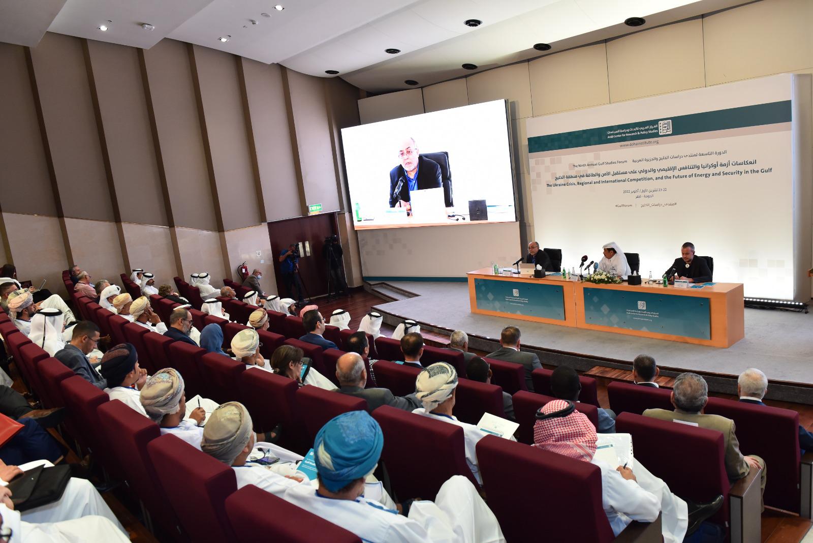 مدار الساعة -انطلقت، يوم السبت 22 تشرين الأول/ أكتوبر 2022، أعمال الدورة التاسعة لمنتدى دراسات الخليج والجزيرة العربية، التي ينظمها المركز العربي للأبحاث ودراسة السياسات، والتي تستمر يومين. ويبحث المنتدى في هذا العام موضوع التداعيات السياسية والأمنية والاقتصادية الناجمة عن الغزو العسكري الروسي لأوكرانيا، وذلك بمشاركة 23 باحثًا من المنطقة العربية ومن خارجها، وُزعت أبحاثهم على سبع جلسات ومحاضرة عامّة. حضر افتتاح أعمال الدورة أعضاء من مجلس الشورى في دولة قطر، وعدد من سفراء الدول العربية والأجنبية وقناصلها، إلى جانب عدد من الأكاديميين الخليجيين، والإذاعة المحلية العُمانية، وشخصيات إعلامية في الدوحة.