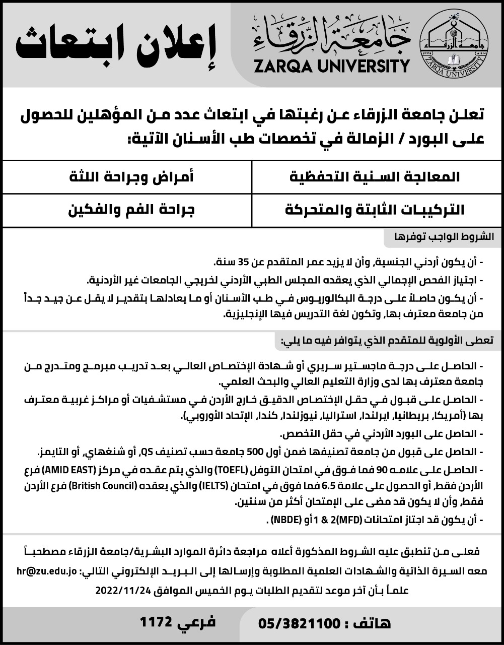 الشروط الواجب توفرها- أن يكون أردني الجنسية، وأن لا يزيد عمر المتقدم عن 35 سنة.- اجتياز الفحص الإجمالي الذي يعقده المجلس الطبي الأردني لخريجي الجامعات غير الأردنية.- أن يكون حاصلاً على درجة البكالوريوس في طب الأسنان أو ما يعادلها بتقدير لا يقل عن جيد جداً من جامعة معترف بها، وتكون لغة التدريس فيها الإنجليزية.....................................................................تعطى الأولوية للمتقدم الذي يتوافر فيه ما يلي:- الحاصل على درجة ماجستير سريري أو شهادة الإختصاص العالي بعد تدريب مبرمج ومتدرج من جامعة معترف بها لدى وزارة التعليم العالي والبحث العلمي.- الحاصل على قبول في حقل الإختصاص الدقيق خارج الأردن في مستشفيات أو مراكز غربية معترف بها (أمريكا، بريطانيا، ايرلندا، استراليا، نيوزلندا، كندا، الإتحاد الأوروبي).- الحاصل على البورد الأردني في حقل التخصص.- الحاصل على قبول من جامعة تصنيفها ضمن أول 500 جامعة حسب تصنيف QS، أو شنغهاي، أو التايمز.- الحاصل على علامه 90 فما فوق في امتحان التوفل (TOEFL) والذي يتم عقده في مركز (AMID EAST) فرع الأردن فقط، أو الحصول على علامة 6.5 فما فوق في امتحان (IELTS) والذي يعقده (British Council) فرع الأردن فقط، وأن لا يكون قد مضى على الإمتحان أكثر من سنتين.- أن يكون قد اجتاز امتحانات 1 & 2(MFD) أو (NBDE)..................................................................فعلى من تنطبق عليه الشروط المذكورة أعلاه مراجعة دائرة الموارد البشرية/جامعة الزرقاء مصطحبـاًمعه السيرة الذاتية والشهادات العلمية المطلوبة وإرسالها إلى الـبـريـد الإلكتروني التالي: hr@zu.edu.joعلماً بأن آخر موعد لتقديم الطلبات يوم الخميس الموافق 2022/11/24....................................................................هاتف :