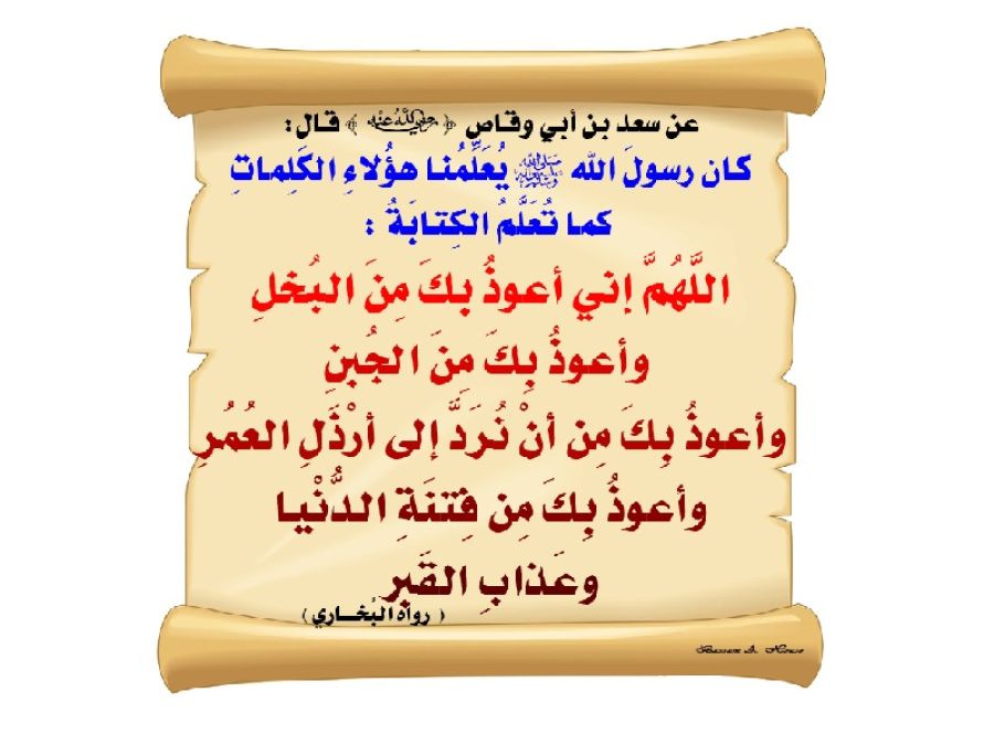 ورواه (2822): عن عَمْرَو بْن مَيْمُونٍ الأَوْدِيّ، قالَ: " كَانَ سَعْدٌ يُعَلِّمُ بَنِيهِ هَؤُلَاءِ الكَلِمَاتِ، كَما يُعَلِّمُ المُعَلِّمُ الغِلْمَانَ الكِتَابَةَ، وَيَقُولُ: إِنَّ رَسُولَ اللَّهِ صلى الله عليه وسلم كَانَ يَتَعَوَّذُ مِنْهُنَّ دُبُرَ الصَّلَاةِ: (اللَّهُمَّ إِنِّي أَعُوذُ بِكَ مِنَ الجُبْنِ، وَأَعُوذُ بِكَ أَنْ أُرَدَّ إلى أَرْذَلِ العُمُرِ، وَأَعُوذُ بِكَ مِنْ فِتْنَةِ الدُّنْيَا، وَأَعُوذُ بِكَ مِنْ عَذَابِ القَبْرِ).