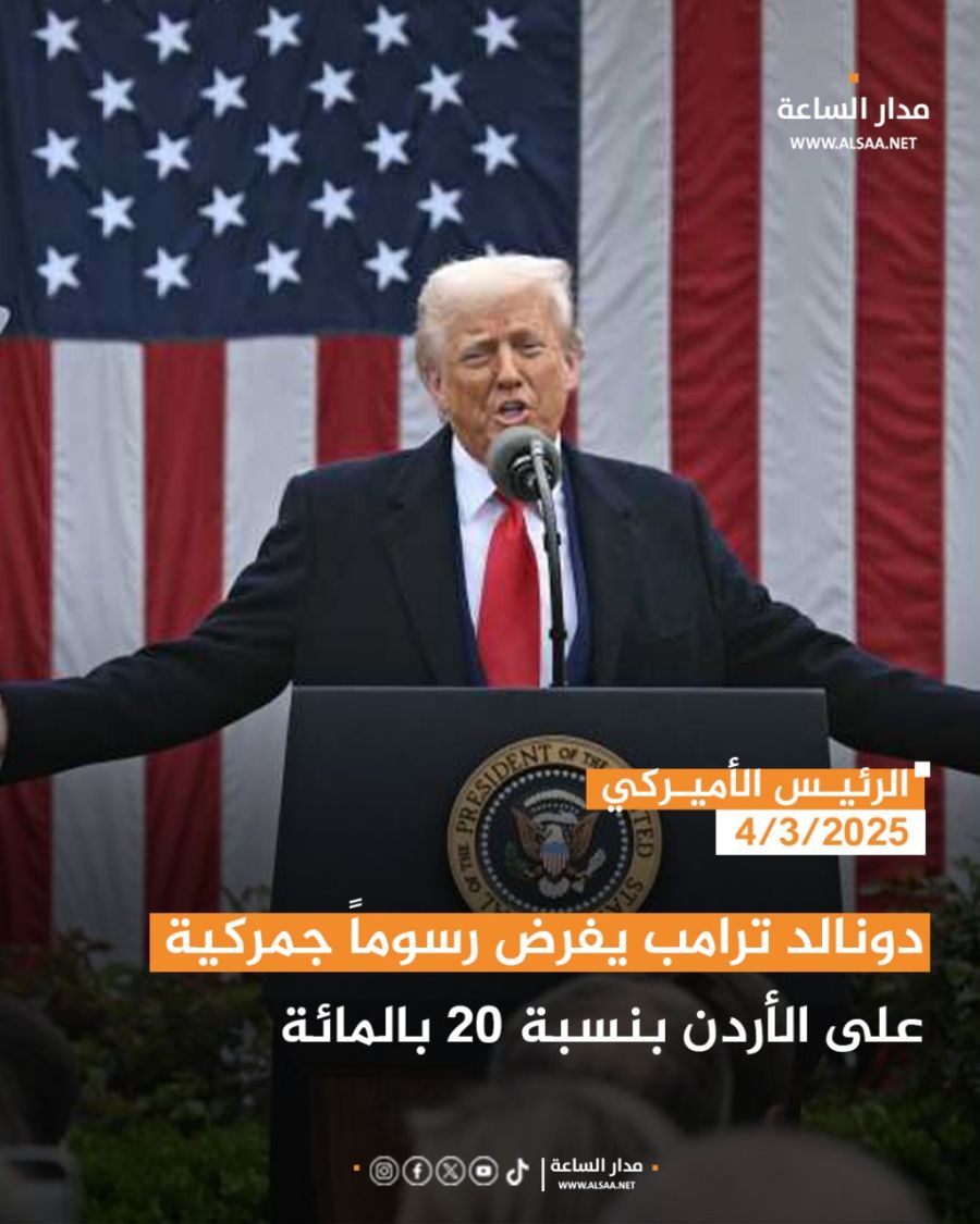 مدار الساعة - أعلن الرئيس الأمريكي دونالد ترمب فرض رسوم جمركية على الأردن بنسبة 20%، مشيرا إلى رسوم جمركية جديدة أطلق عليها اسم "تعرفات يوم التحرير".