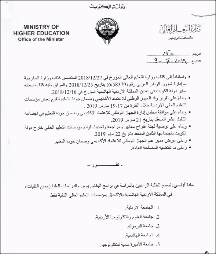 وثائق رسمية صادرة عن وزارة التعليم العالي الكويتية، أشارت إلى أن الوزارة اتخذت القرار يوم الثالث من تموز الجاري، وبناء على تقرير وفد الجهاز الوطني للاعتماد الأكاديمي الكويتي.